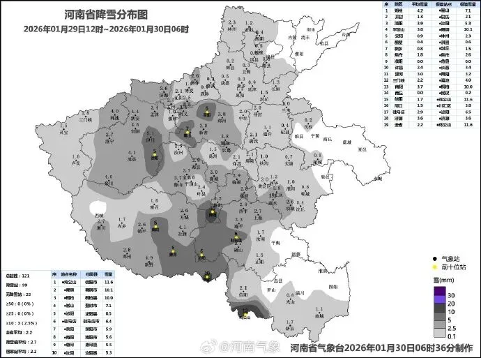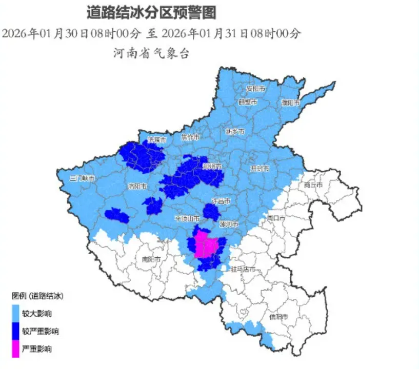 预计1月30日8时到31日8时,北部、西部、中南部仍有积雪,且路表温度低于0°C,将出现对交通有较大影响的道路结冰,其中济源南部、三门峡北部、洛阳北部和东部、郑州西部和南部、许昌南部、平顶山北部和南部、南阳东北部、驻马店西部将出现对交通有较严重影响或严重影响的道路结冰。请注意防范。上述地区的相邻县(市、区)也需关注。