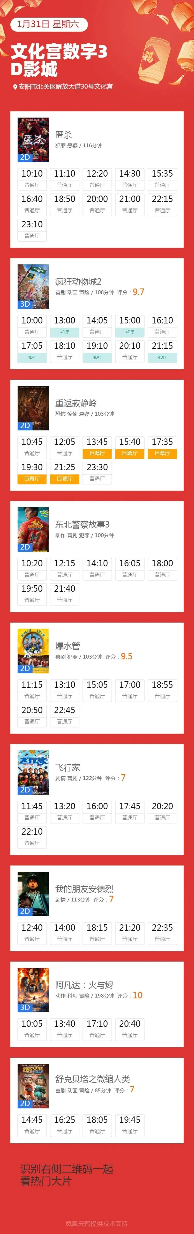 >安阳市工人文化宫数字3D影城1月31日影讯