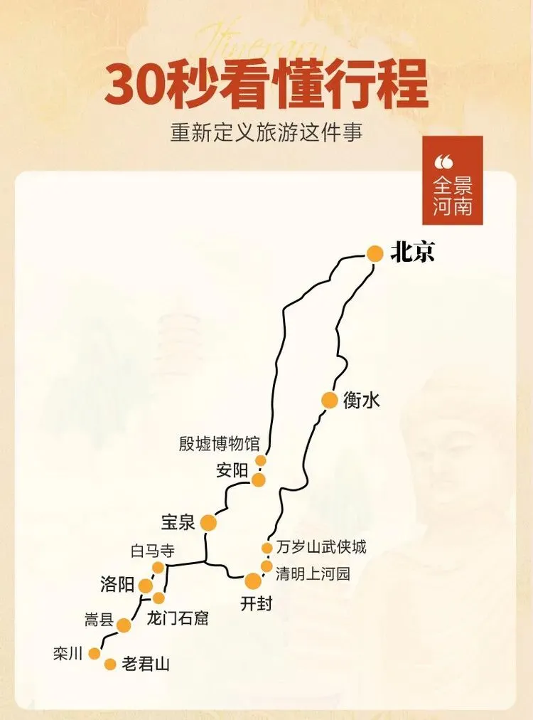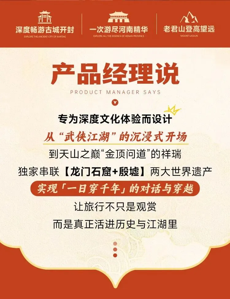 【开封】八朝古都,北宋都城 “汴京”,以宋文化为核心,兼具历史厚重感与市井烟火气,特色是 “一河两街三秀”:汴河、宋都御街 / 书店街、实景演出秀、非遗秀、民俗秀;