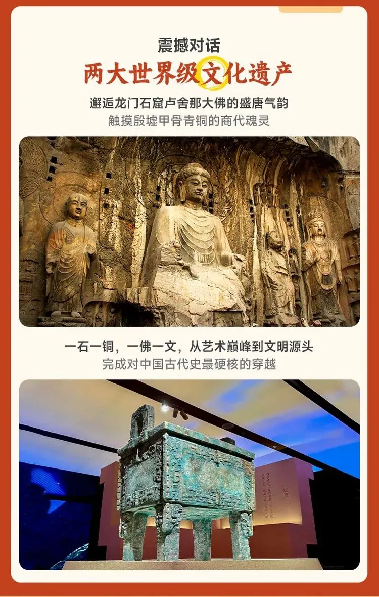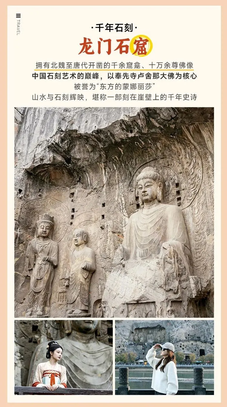 【龙门石窟】与敦煌莫高窟、云冈石窟、麦积山石窟并称中国四大石窟,被联合国教科文组织评价为 “中国石刻艺术的最高峰”。始凿于北魏孝文帝迁都洛阳(公元 493 年),历经东魏、西魏、北齐、隋、唐、五代、宋等朝代连续大规模营造达400 余年,南北长约 1 公里,现存窟龛 2345 个、造像 10 万余尊、碑刻题记 2800 余品,是世界上造像最多、规模最大的石刻艺术宝库;