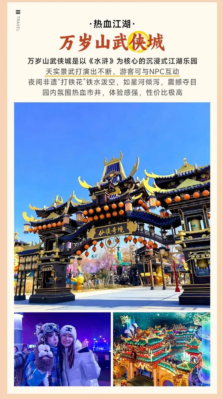 推荐演出:《三打祝家庄》《沙场打铁花》《神舟传奇》《江湖绝技》、NPC互动等(部分演出需要预约,演出以官方公告安排为准);