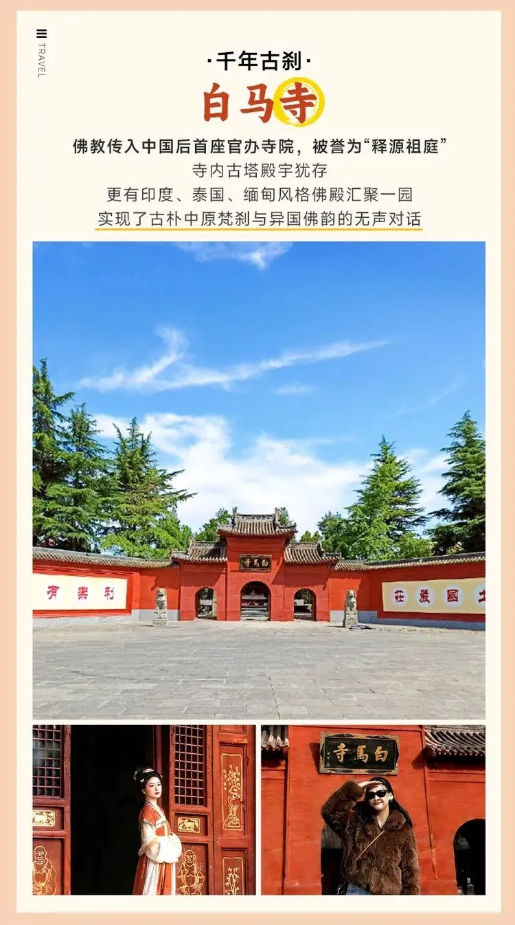 【白马寺】是佛教传入中国的发源地,东汉永平七年,汉明帝夜梦金人,派使西行求法;永平十一年,天竺高僧摄摩腾、竺法兰以白马驮载佛经佛像抵洛,明帝敕建寺院,因白马驮经之功得名 “白马寺”;