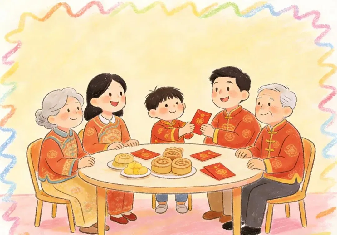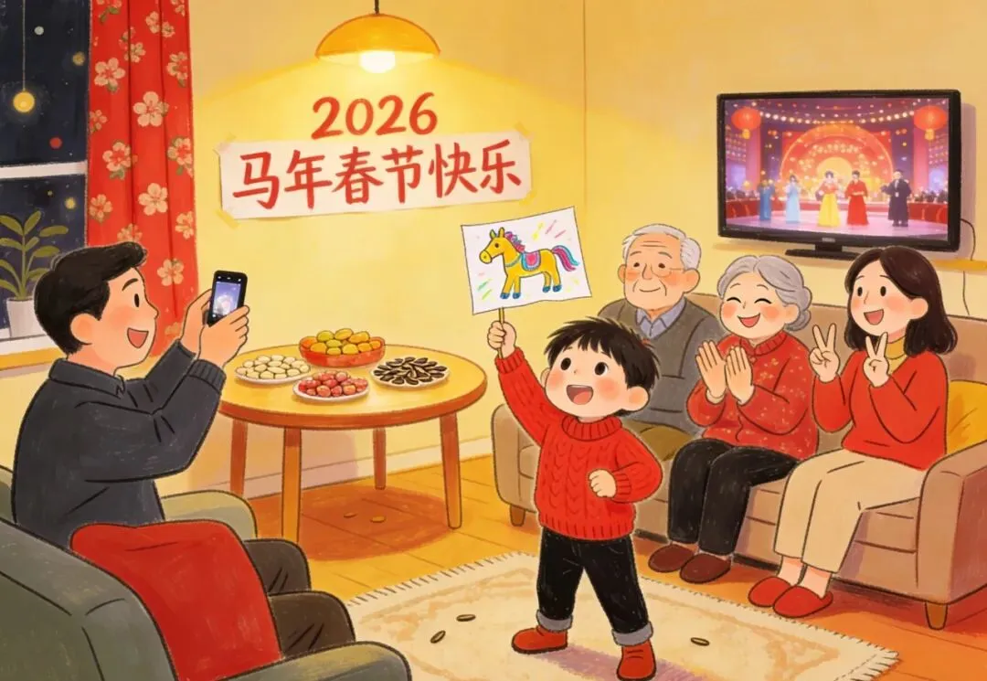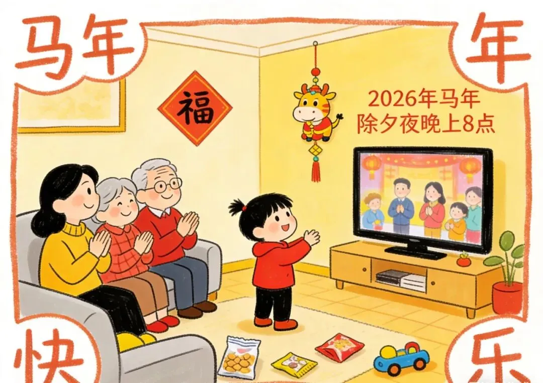除夕夜晚上8点,全家一起看春节联欢晚会,演员们用精彩的表演传递新年祝福。小朋友们也来当小小表演家,给家人唱一首好听的歌、跳一段可爱的舞,用自己的方式为新年添欢乐,让这个马年除夕更热闹!