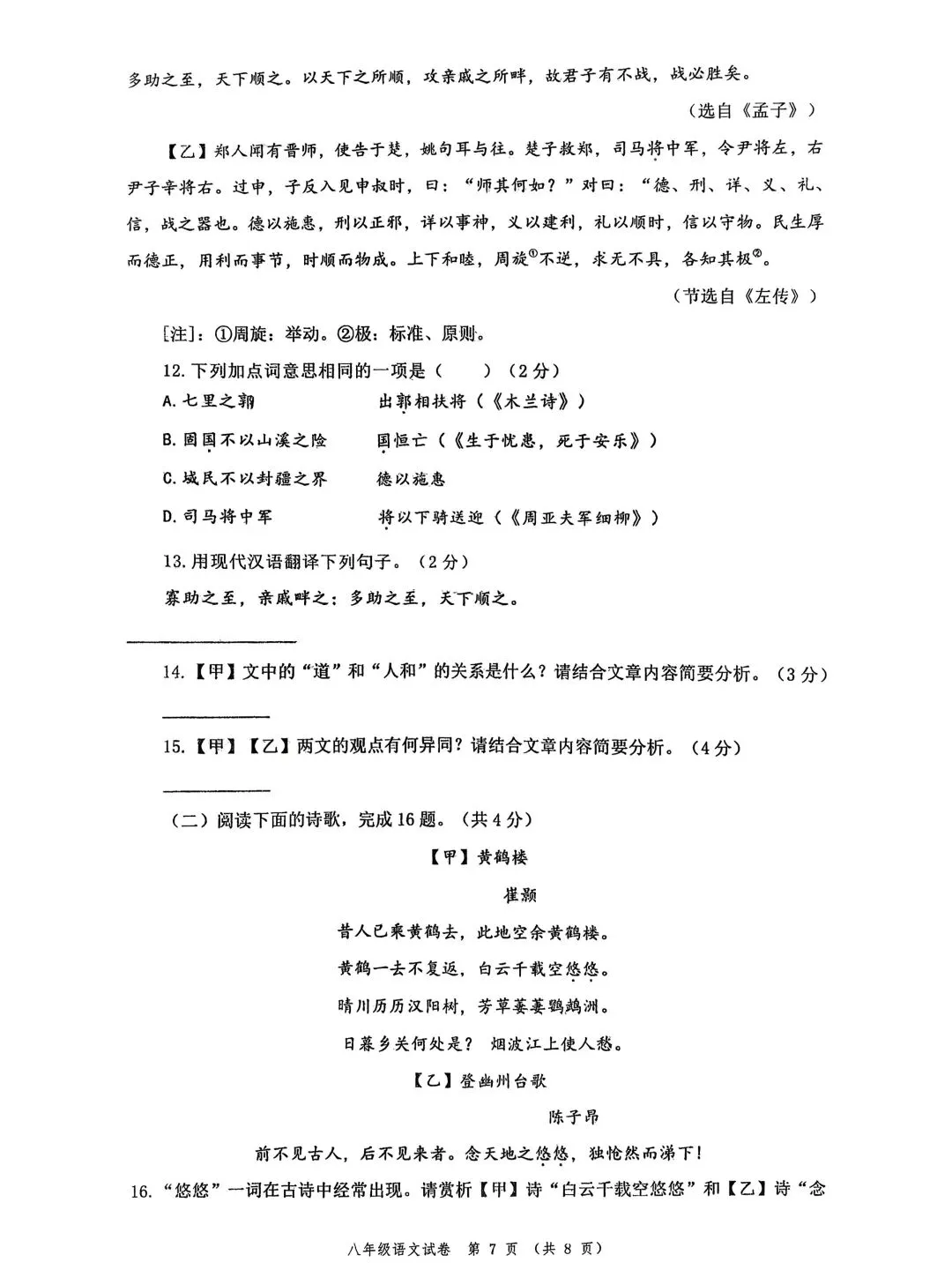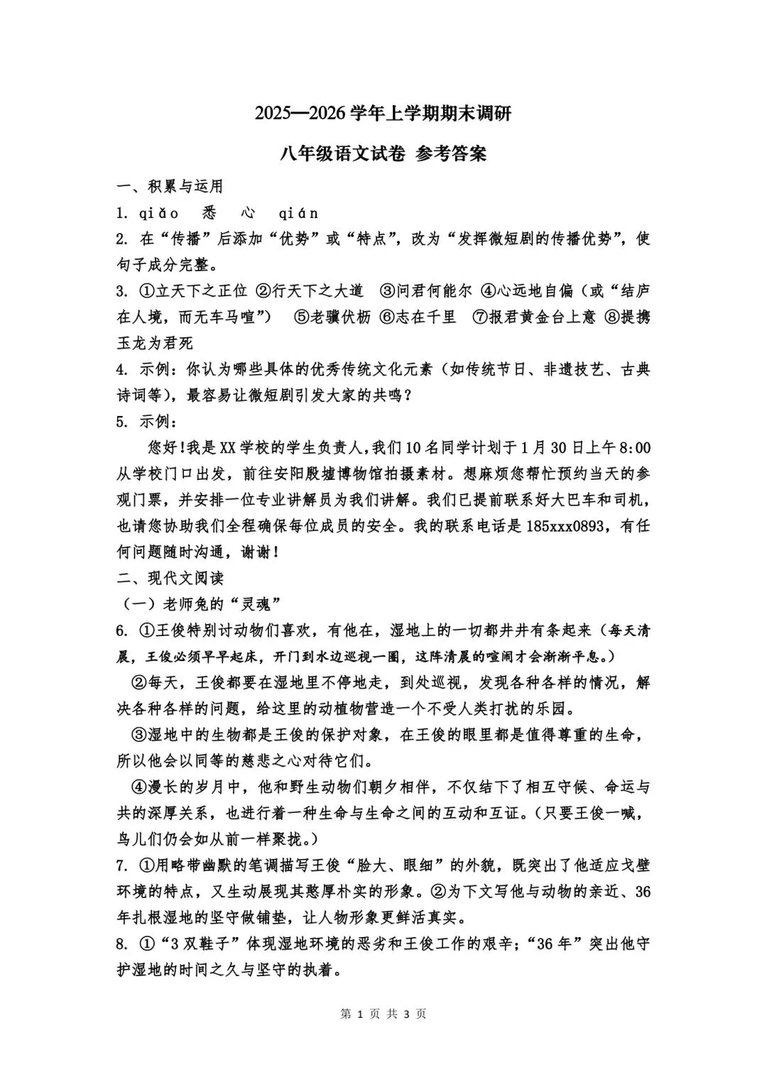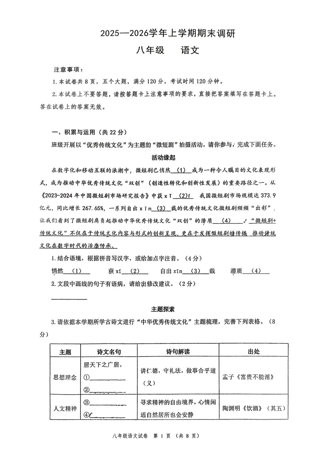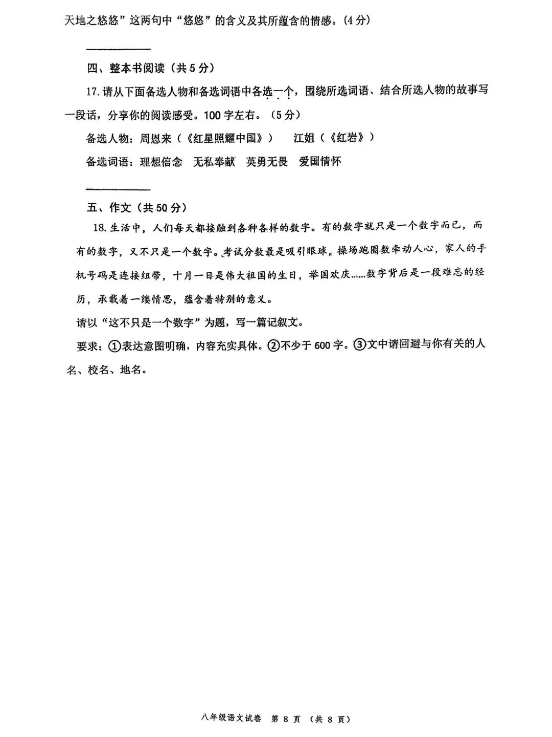 >郑州中学2025-2026学年上学期八年级语文期末试卷及答案