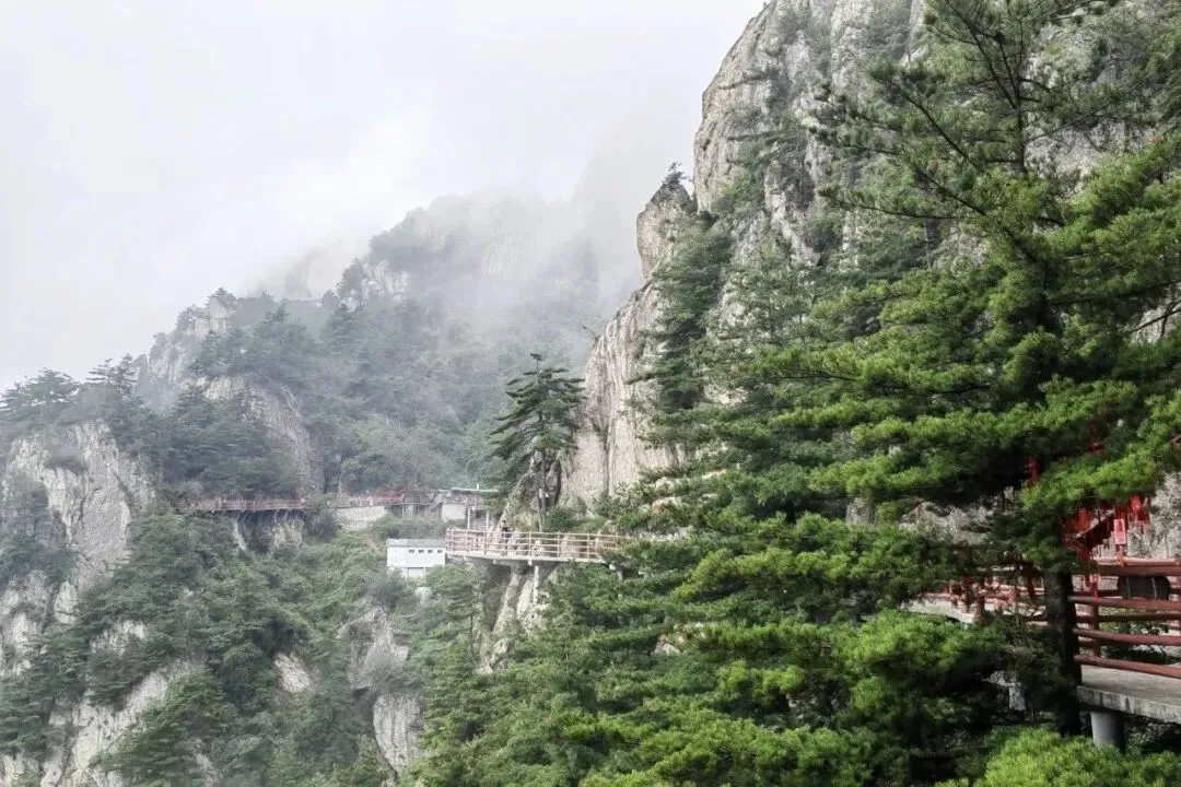 不过,最美的路途藏在“十里画屏”。若是时间从容,一定要沿栈道慢行。这条路在半山蜿蜒,一侧是峭壁,一侧是云雾笼罩的深谷,若遇上云海,简直如行天境。许多人说,不走十里画屏,便不算真正到过老君山。