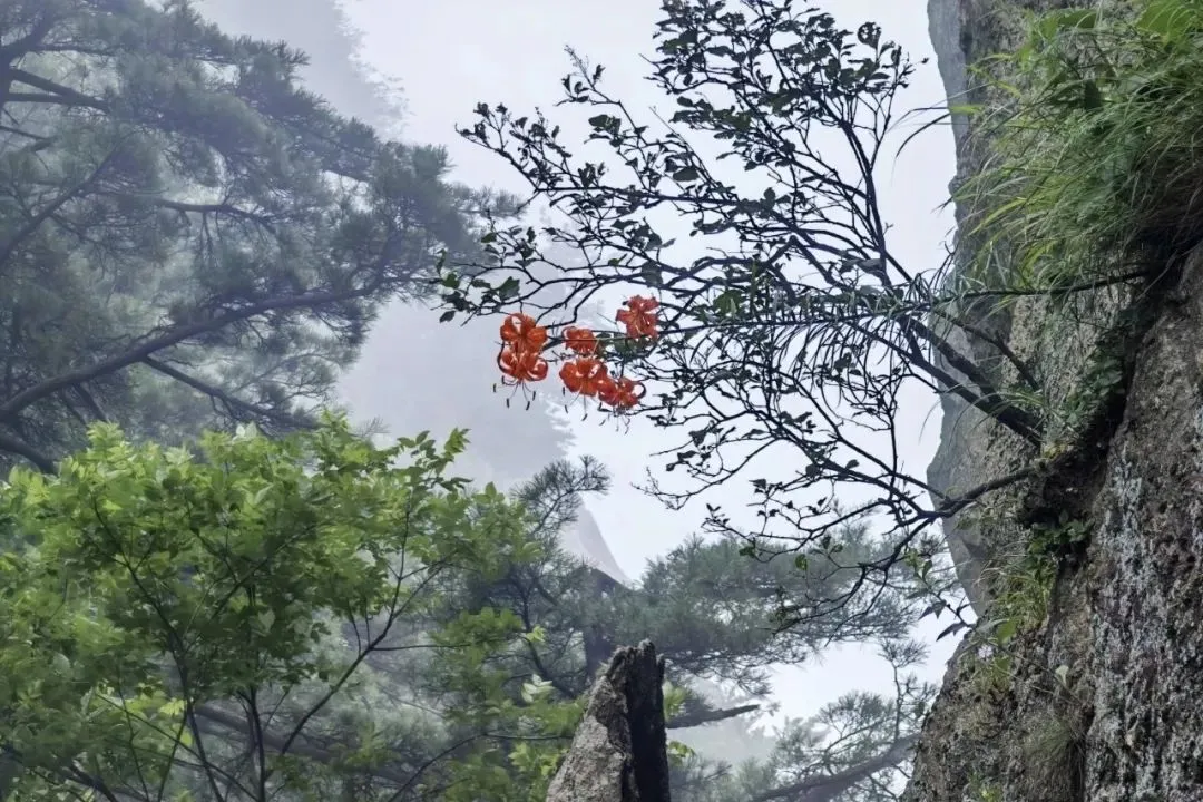 一路行走,山丹丹偶尔点缀在绿意间,红得鲜活,像是山野写的诗。直到海拔2279米的伏牛山主峰立于眼前——这里不仅是山巅,也是长江与黄河的分水岭。山间气候多变,方才还是晴空,转眼细雨随风而来,温度骤降,仿佛一日历经四季。