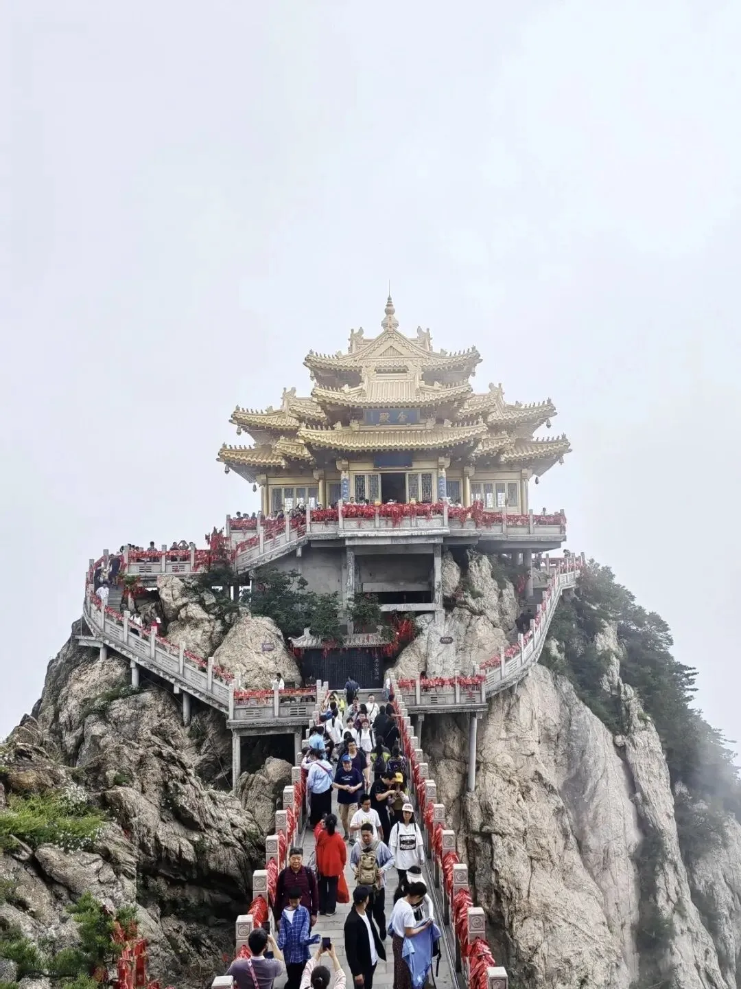 雾气缭绕时,金顶建筑群若隐若现,宛如《西游记》中的天宫浮现眼前。老君庙、金殿、亮宝台、玉皇顶、五母殿依次而立,其中五母殿供奉天、地、人、无极、西王母,静默中传递着深厚的文化脉络。