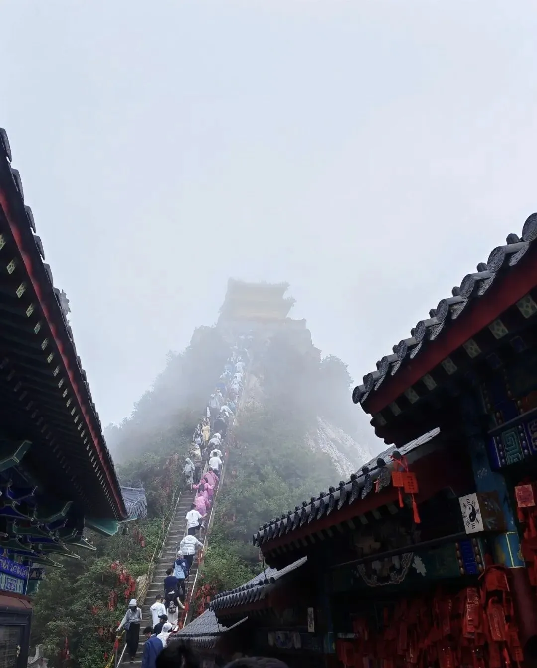 从中天门再向上,若选择步行,便是层层台阶;若续乘二级索道,则能直达高处,离金顶仅一步之遥。