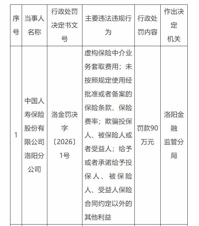中国人寿保险股份有限公司洛阳分公司(洛金罚决字〔2026〕1号)存在诸多违法违规行径。其虚构保险中介业务以套取费用,未依规使用经批准或者备案的保险条款与保险费率,还欺骗投保人、被保险人或者受益人,甚至给予或者承诺给予投保人、被保险人、受益人保险合同约定以外的其他利益。鉴于此,洛阳金融监管分局对其处以90万元罚款。