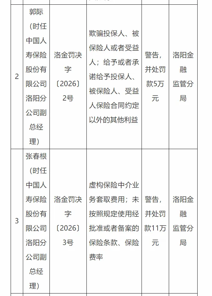 郭 际(时任中国人寿保险股份有限公司洛阳分公司副总经理,洛金罚决字〔2026〕2号),存在欺骗投保人、被保险人或者受益人,以及给予或者承诺给予投保人、被保险人、受益人保险合同约定以外的其他利益的行为,洛阳金融监管分局对其予以警告,并处罚款5万元。