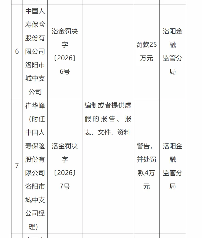 中国人寿保险股份有限公司洛阳市城中支公司(洛金罚决字〔2026〕6号),编制或者提供虚假的报告、报表、文件、资料,洛阳金融监管分局对该公司处以25万元罚款。