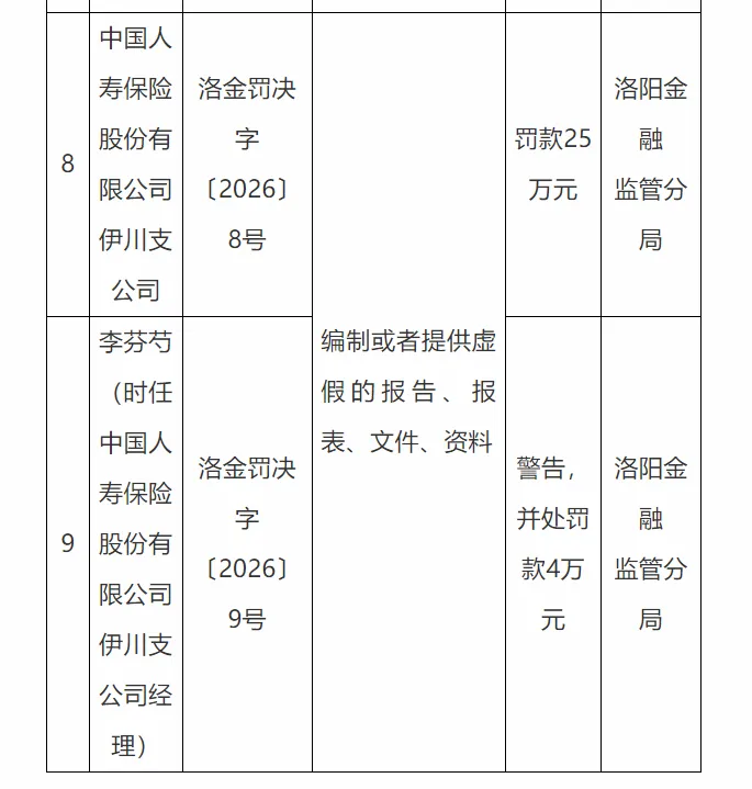 中国人寿保险股份有限公司伊川支公司(洛金罚决字〔2026〕8号),编制或者提供虚假的报告、报表、文件、资料,洛阳金融监管分局对其罚款25万元。