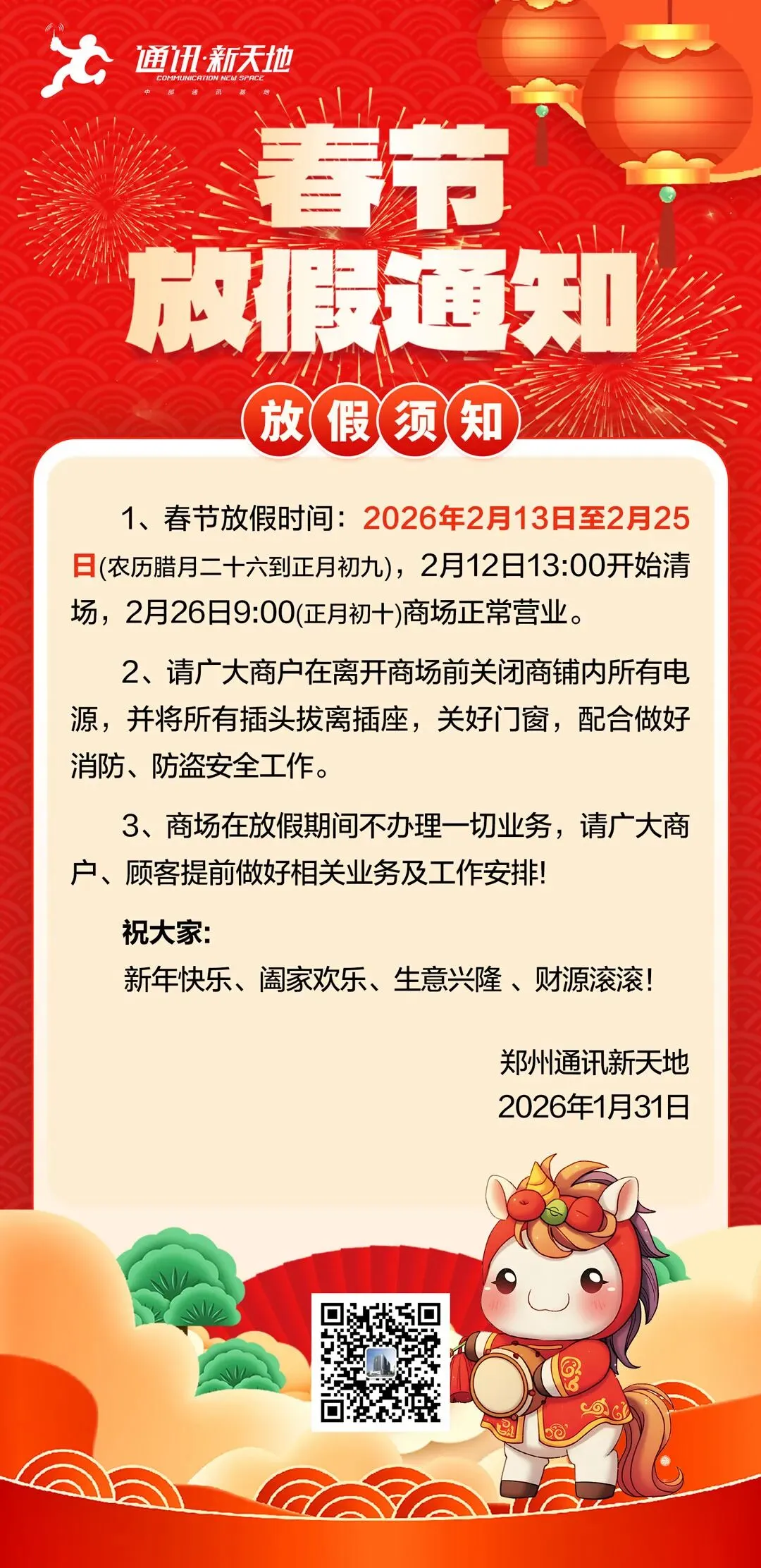 郑州通讯新天地春节放假通知