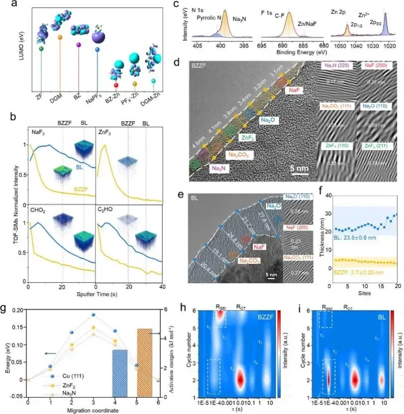 图2 | 高熵SEI的表征。(a)电解液中溶剂、阴离子、添加剂和配位络合物的LUMO能级计算(插图:模拟的LUMO分布快照)。(b)BZZF和BL电解液溅射SEI层中NaF2、ZnF2、CHO2和C2HO离子在0-40秒溅射期间的归一化深度分布(插图:对应的三维TOF-SIMS离子分布图)。(c)在BZZF电解液中循环5圈后的钠阳极的XPS表征,包括N 1s、F 1s、Zn 2p和Na 1s谱。(d)BZZF和(e)BL电解液中循环5圈后形成的SEI的冷冻透射电镜图像。(f)从BZZF和BL样品中随机选取20个点收集的SEI厚度值的统计比较。(g)通过NEB方法确定的Na+沿Cu(111)、ZnF2和Na2N界面的能量分布图,以及从在-10°C至40°C下进行的变温阻抗测量中提取的活化能。(h, i)使用不同电解液组装的Na||Cu半电池在不同循环次数下由EIS数据导出的弛豫时间分布(DRT)演化。