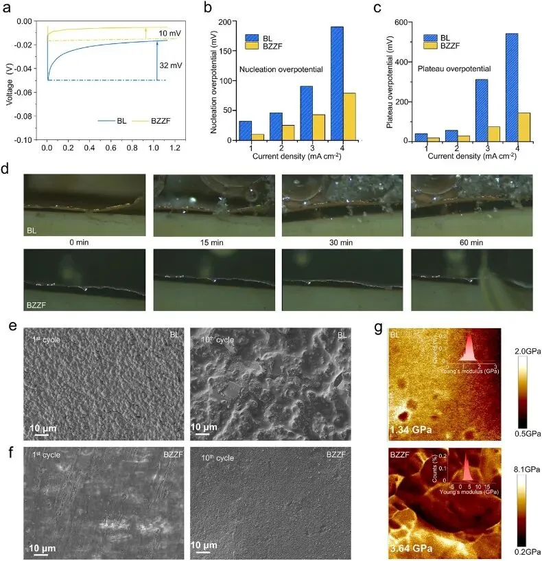 图3 | 利用高熵SEI进行钠沉积分析。 (a)在不同宿主材料上于1mA cm-2电流密度下进行钠成核时的恒电流放电曲线。(b)在不同电流密度(1、2、3、4 mA cm-2)下测试的各种宿主材料的成核过电位和(c)平台过电位。(d)BL和BZZF电解液中在0、15、30、60分钟时钠沉积的原位光学显微镜图像。使用(e)BL和(f)BZZF电解液在1mAh cm-2容量下沉积钠后的Cu箔扫描电镜图像。(g)首次循环后使用不同电解液的Cu箔的杨氏模量分布图(插图:杨氏模量的分布图)。