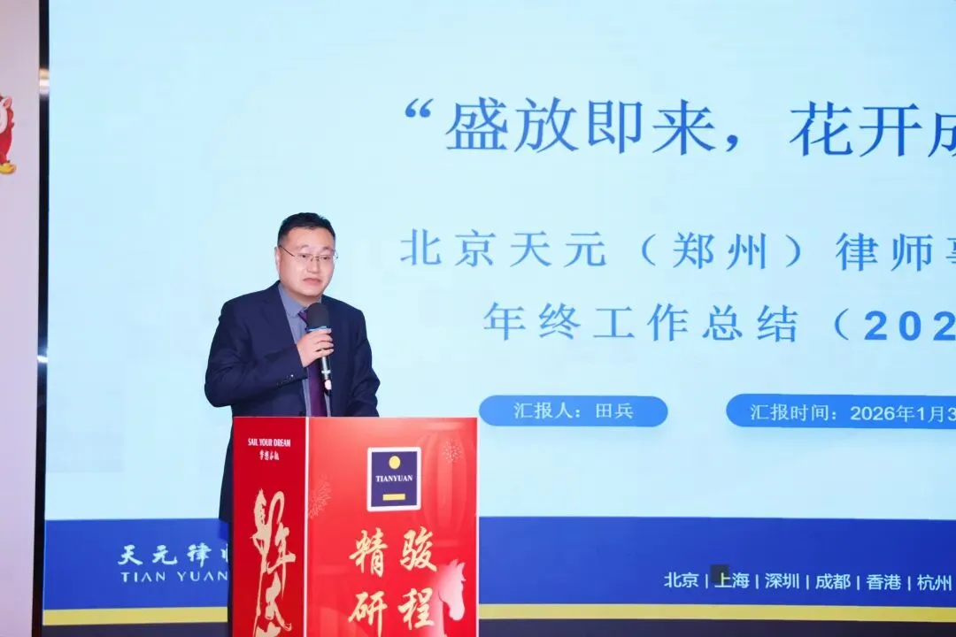 年会首先由管委会主任田兵律师作《律所2025年度工作总结报告》,他系统回顾了过去一年律所在律所人员发展、制度迭代、队伍建设、学习建设、业务拓展与成绩、重大活动与荣誉以及社会责任与公益业务等方面取得的成就,报告以详实数据印证实绩,用鲜活案例彰显风骨,既系统梳理全年耕耘硕果,亦生动诠释天元人凝心聚力、奋勇争先的实干底色。同时,田兵主任锚定2026年发展航向,明确“深耕专业、拓展边界、党建引领、协同共赢”的核心路径,为律所高质量发展指引方向、凝聚共识。2024 年,我们从“头”开始;2025 年,我们静待花开;2026年,愿每一朵专业之花,汇聚成海。