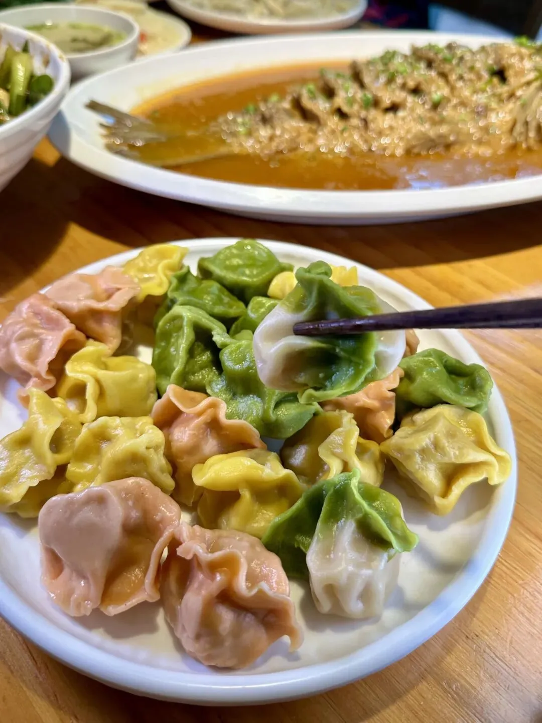 还有现冲的紫菜酸汤彩色的那盘是混合馅儿的全家福,四种口味