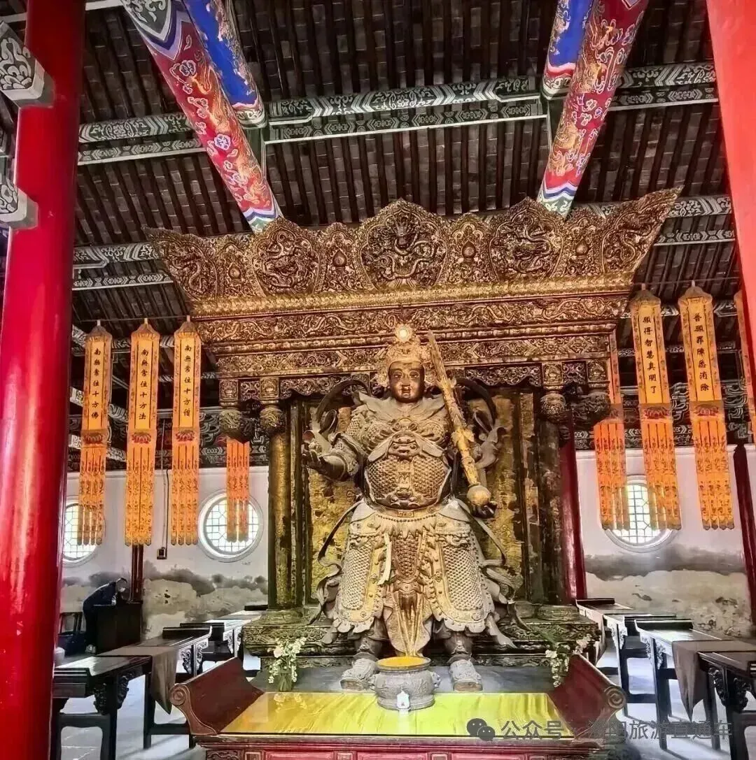 为高台歇山式建筑,初建于元代,明代重建,东西面阔5间,南北进深3间,殿内正中安置着从故宫运来的雕龙贴金佛龛,内供明代“夹纻”大肚弥勒佛像、两侧为清代泥塑四大天王像、韦驮天将像,象征佛教护法功能等。