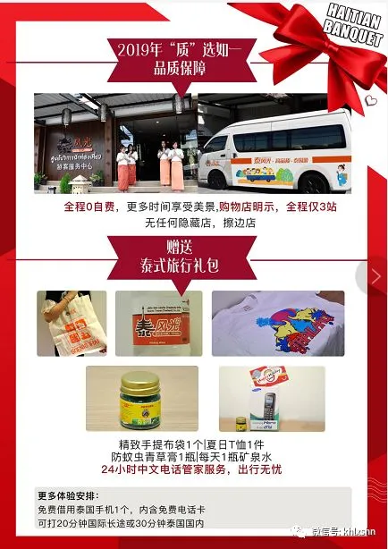 每人赠送精制手提布袋1个、夏日T恤1件、防蚊虫青草膏1瓶、每天1瓶矿泉水,免费借用泰国手机1个(内含免费电话卡,可打20分钟中国国际长途或30分钟泰国国内)