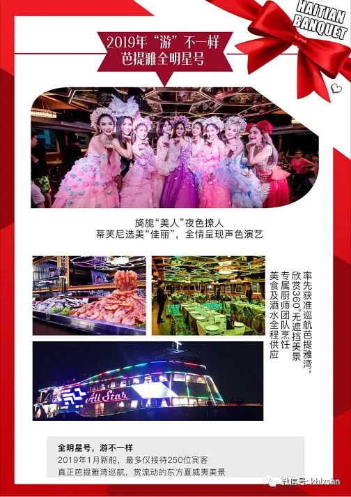 【芭提雅“全明星”号】2019年全新投入的芭提雅星级游船,唯一获准在芭提雅湾巡航的夜间娱乐游船,提供泰国最具特色的人妖表演,所有佳丽均为历届蒂芙尼人妖选美的入选美女。同时提供特色船餐,可享受芭提雅美食美景。