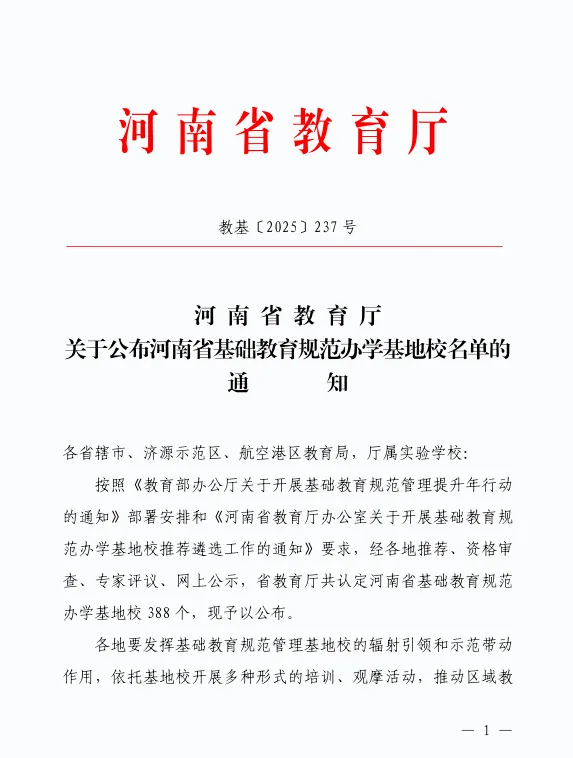喜报——郑州高新区实验幼儿园荣膺河南省基础教育规范办学基地校