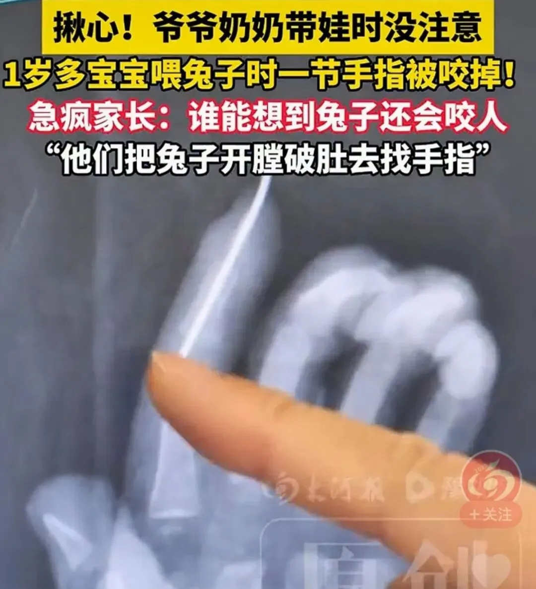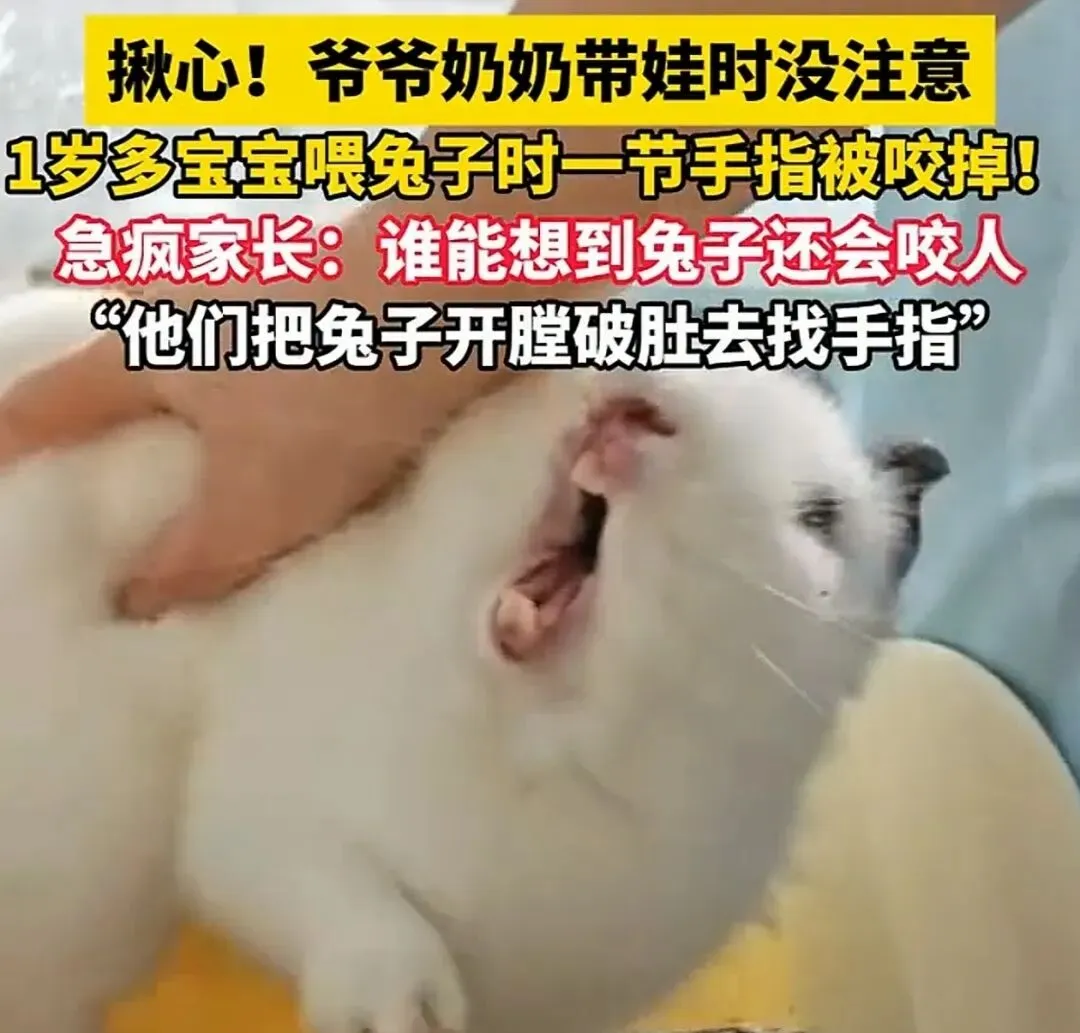 1岁7个月的乐乐拿着茄子蹲在兔笼旁,想喂喂这只毛茸茸的小伙伴。谁也没想到,就在茄子递过去的瞬间,平日里软萌的兔子突然露出牙齿,狠狠咬住了孩子的手指。一声撕心裂肺的哭喊让全家人的心都揪紧了。爷爷奶奶冲过来时,只看到乐乐鲜血直流的小手——食指末节已经不见了踪影。