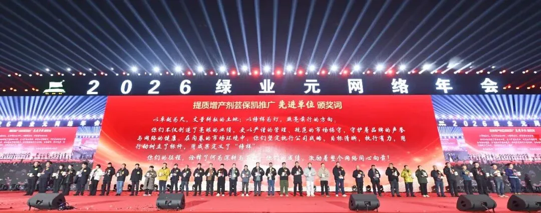 范总指出,任何一家企业的持续发展,都离不开“五项管理”:心态管理、目标管理、运营管理、效率管理、行动管理。他强调,只要这五个方面做得好,团队必然成长,销售必然增长,企业一定在发展强大的进程中。范总的培训,源于几十年的经营管理实践,深入浅出、直击本质,为全体网络家人献上了一堂既深刻又实用的管理运营课,赢得全场阵阵掌声。30日晚,一场由绿业元员工自编自导的盛大颁奖联欢晚会,将本届年会气氛推向高潮。本次大会,是一次全国网络家人的盛大团聚,更是一场高价值、强赋能的年度培训盛会。大会的成功召开,加深了网络感情,赋能了团队运营,明确了发展战略,全网全员斗志昂扬,携手奋进,必将加快提质增产技术的推广与应用,实现2026年持续增长,为我国粮食安全和农业增产农民增收做出更大贡献!