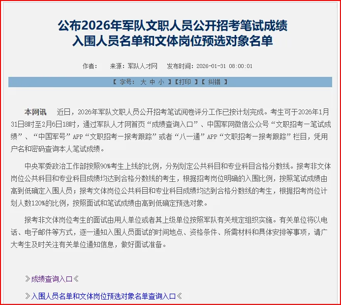 5.军队文职公布笔试分数,快查分。