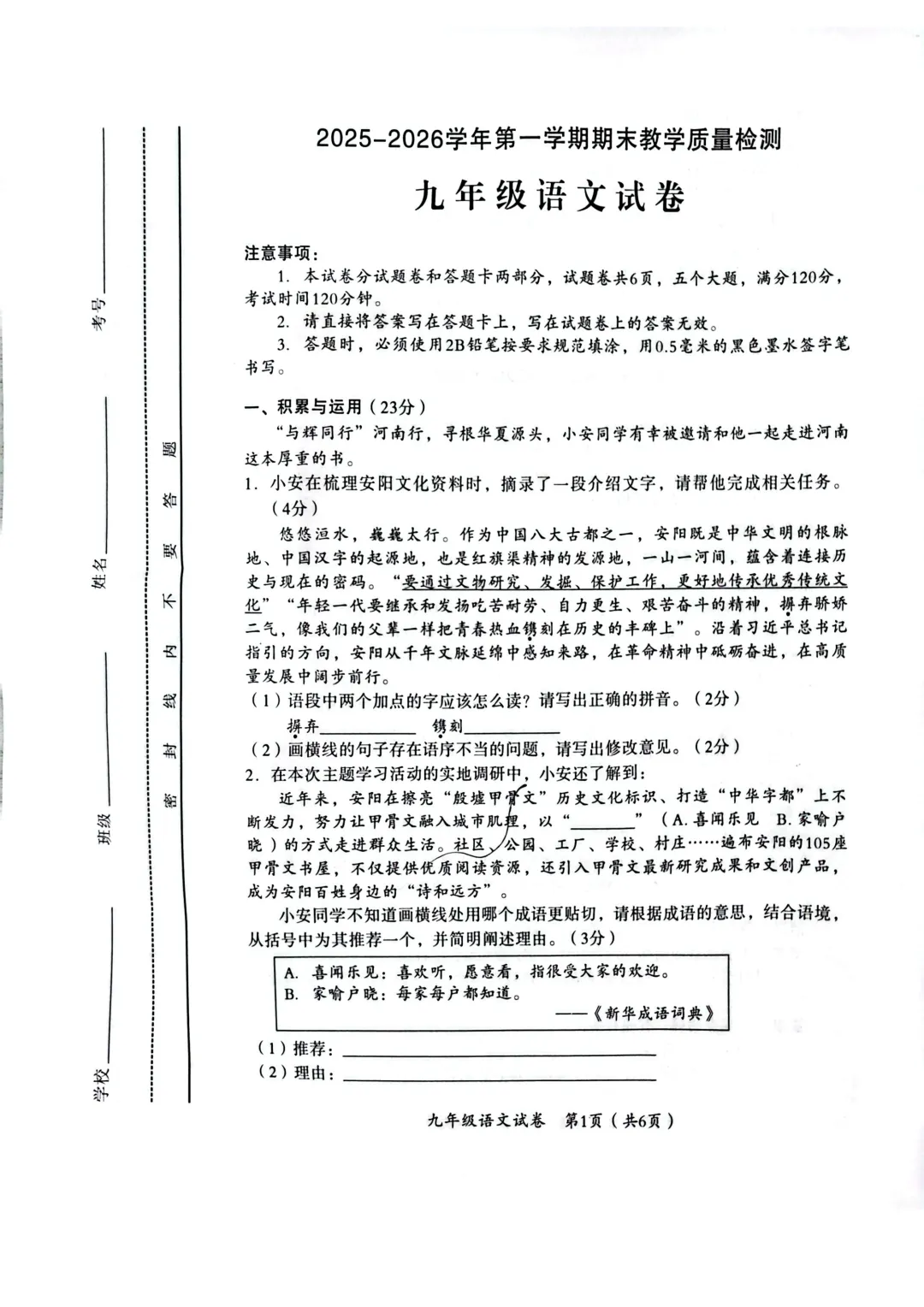 本试卷紧扣九年级课标,以'河南文化寻根'为主线整合古诗文默写、现代文阅读、写作等核心能力。基础题如字音字形、名句填空注重积累;难点集中在需要深度思辨的题目(如《指痕里的光》人物形象分析、AI幻觉现象评析),对学生的文本解读和批判性思维要求极高,体现了卓越的文化传承与时代融合导向。<点击图片查看全卷>