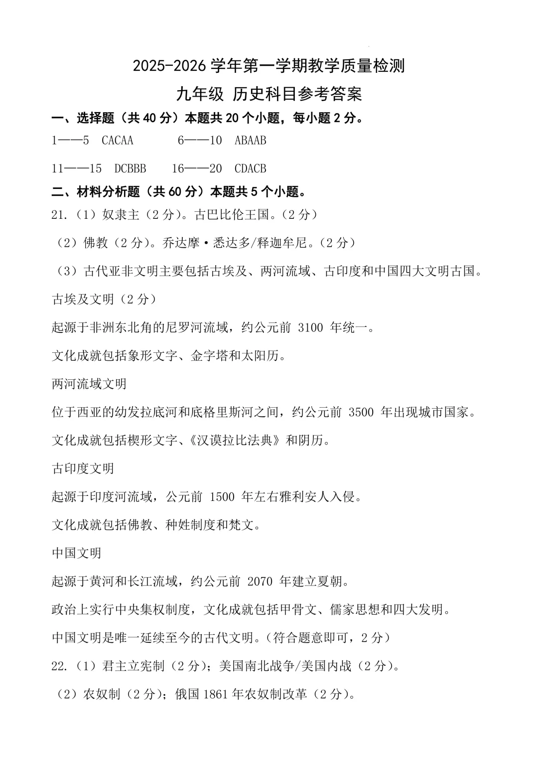 本试卷紧扣九年级历史课标,全面考察古代文明、资产阶级革命、两次世界大战等核心内容。基础题如文明特征判断、事件排序注重史实积累;难点集中在需要深度分析的材料题(如第21题《汉谟拉比法典》石柱分析[](@replace=1)、第25题时间轴论述题),对学生的史料解读和跨时空思维能力要求较高,体现了良好的区分度与学科素养导向。<点击图片查看全卷>