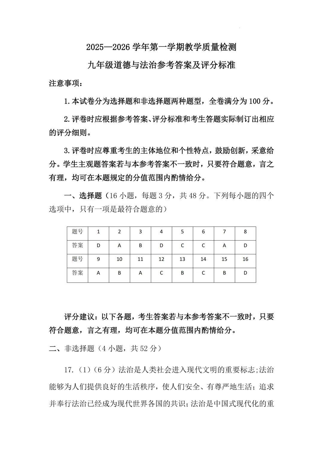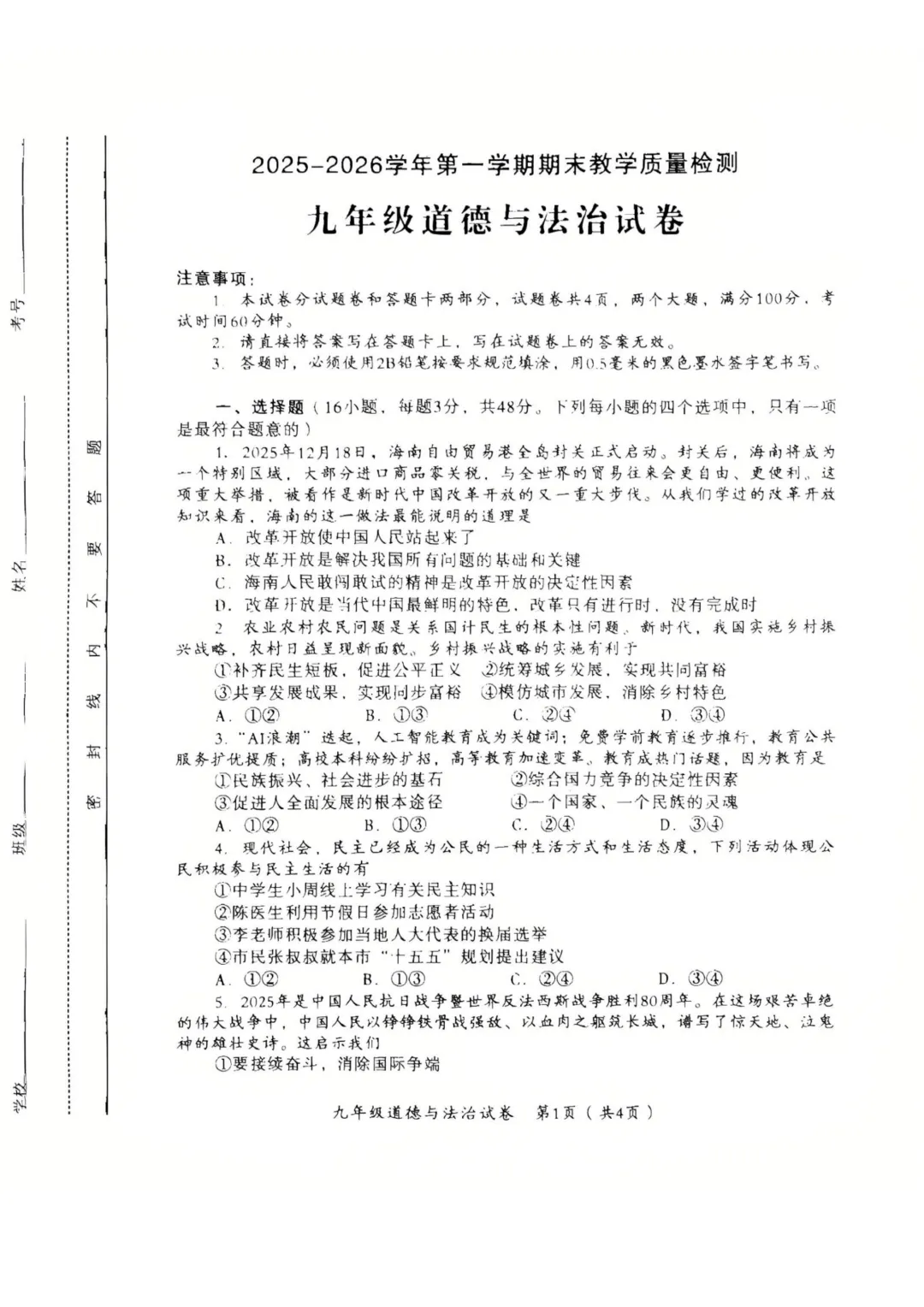 本试卷紧扣九年级课标,全面考察改革开放、民主法治、文化建设、国家安全等核心内容。基础题如概念判断、政策对应注重价值认同;难点集中在需要深度分析的综合题(如第17题法治建设论述、第20题'十五五'规划探究),对学生的价值判断和综合思维能力要求较高,体现了卓越的创新性与育人导向。<点击图片查看全卷>