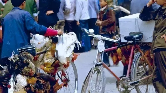 这个场景老热闹了,自行车后座两边横着竹竿,绑满活鸡,羽毛一抖一抖的,车主一脚着地一脚蹬着慢滑,嘴里喊“新鲜的呀”,我妈听见就拎着篮子追两步,摸一把鸡胸口说还挺壮,讨价还价几句,秤一提,钱一塞,路边就拔了毛开膛,回家炖锅汤,屋里满是香味.