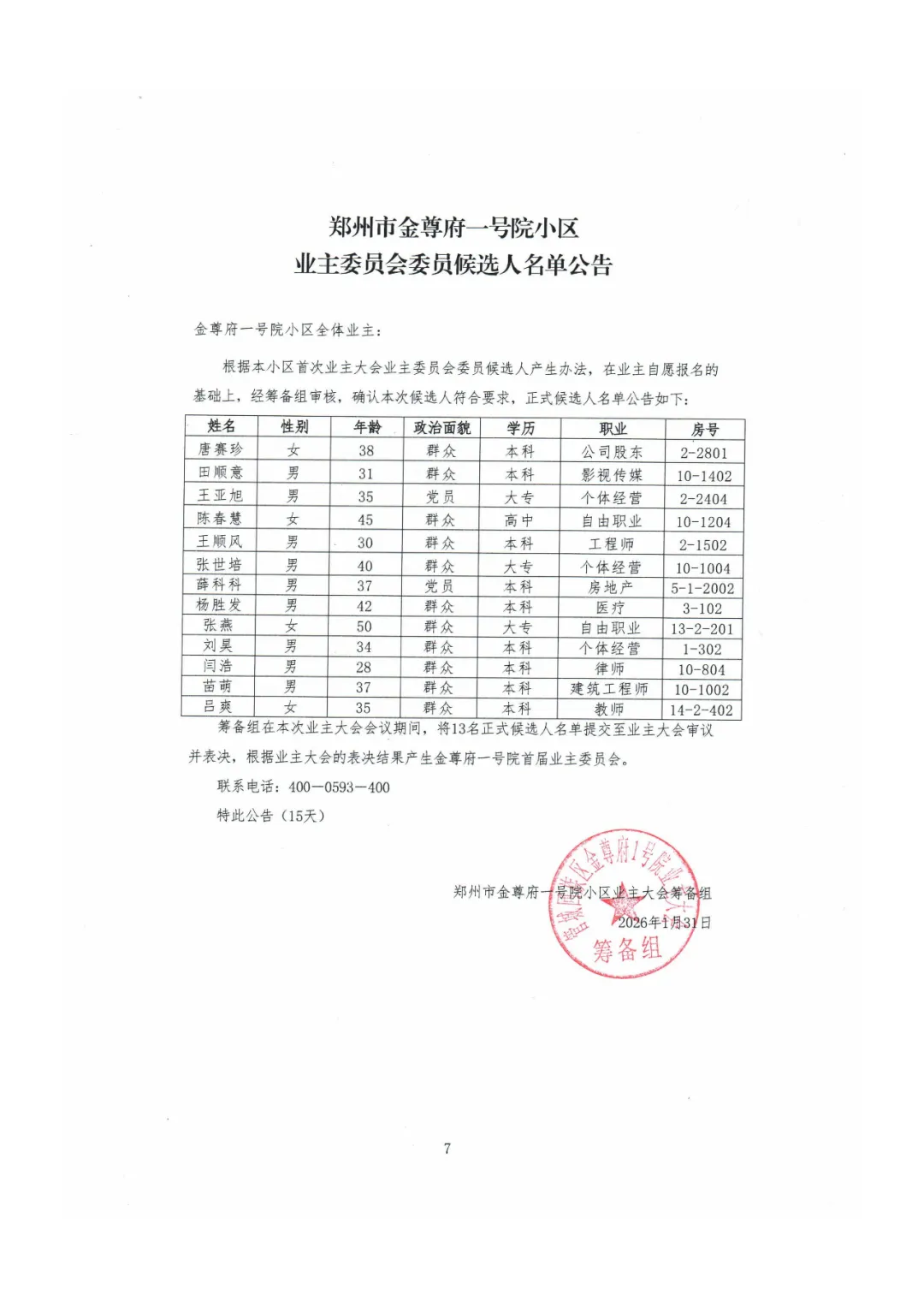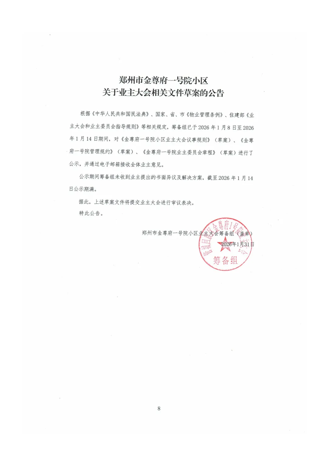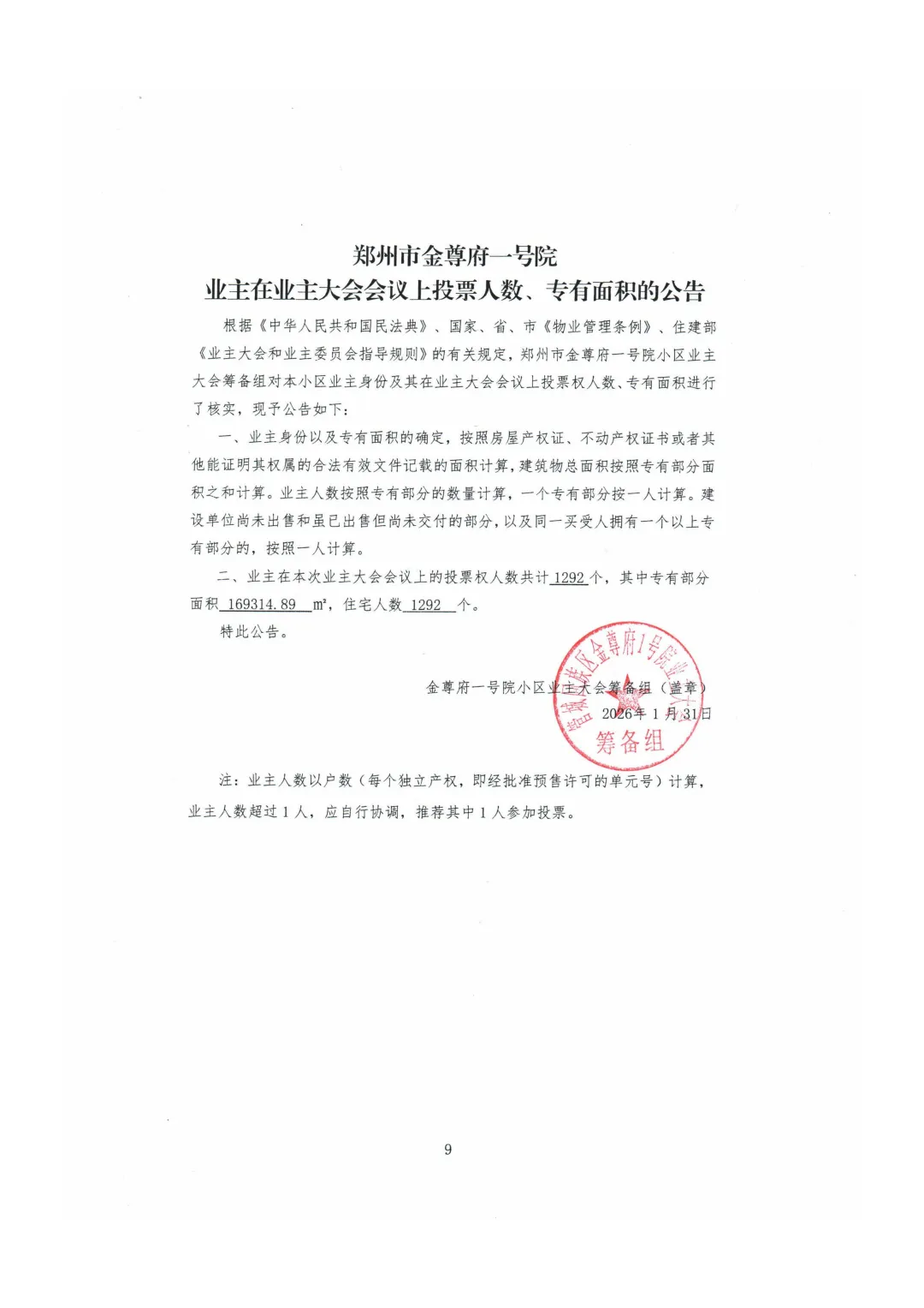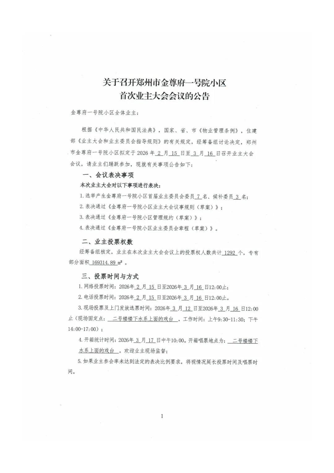 根据《中华人民共和国民法典》、《河南省物业管理条例》、《郑州市物业管理条例》及住建部《业主大会和业主委员会指导规则》的有关规定,经筹备组讨论决定,郑州市金尊府一号院小区拟定于2026年2月15日至2026年3月16日召开首次业主大会会议。这是一次凝聚共识、共建美好家园的重要会议,也是小区自治管理迈出的关键一步,请各位业主踊跃参与,共同见证并决定小区的未来。现就有关事项公告如下: