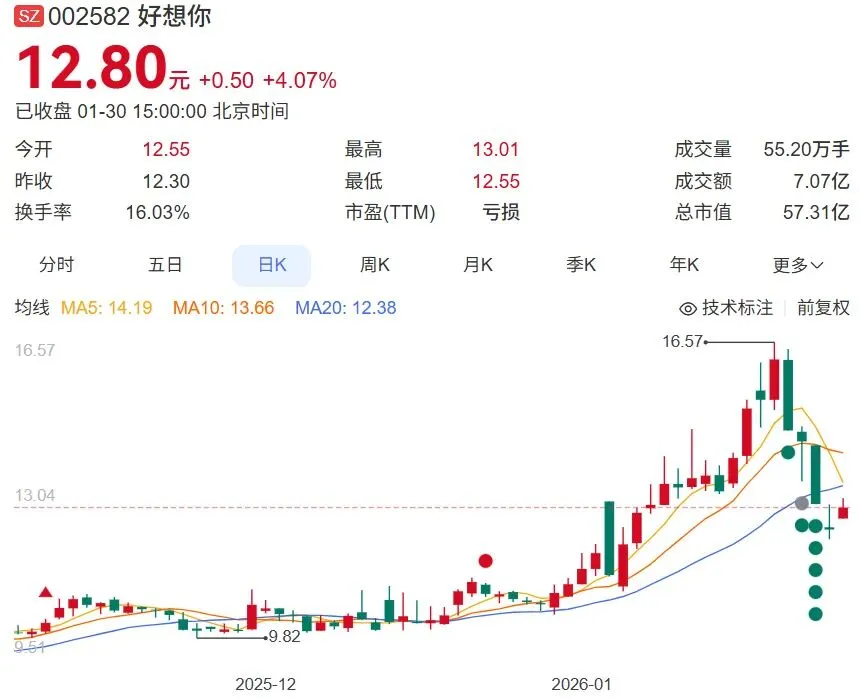 只是,利好兑现下,好想你的股价持续下行。1月30日其收报12.8元/股,回升4%,总市值约57.3亿元。