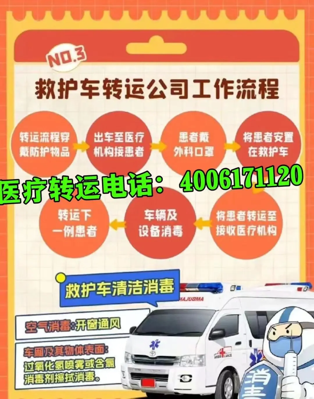 120非急救车辆 我公司承接高铁转运病人航空转运病人 救护车转运’长途跨省转运病人新生儿、骨折、重症、危重症患者,行动不便者复查,转院、转诊、跨省回家,我们都能专业承接。专业救护车配备先进设备,随车医护经验丰富,全程守护生命安全。无论何时何地,只要您有需求,拨打 4006171120 即可预约。我们费用透明合理,详细费用等您咨询,为您提供安心、可靠的转运服务。
