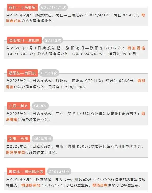 ⊙火车出行请收藏!今日起,部分列车已调整停站及时刻今日可以购买春节假期首日(2月15日)的火车票了。有坐火车出行需求的小伙伴要注意,自2026年2月1日始发站起部分列车将调整停站及时刻。具体如下↓↓(央视新闻 郑州铁路)▼
