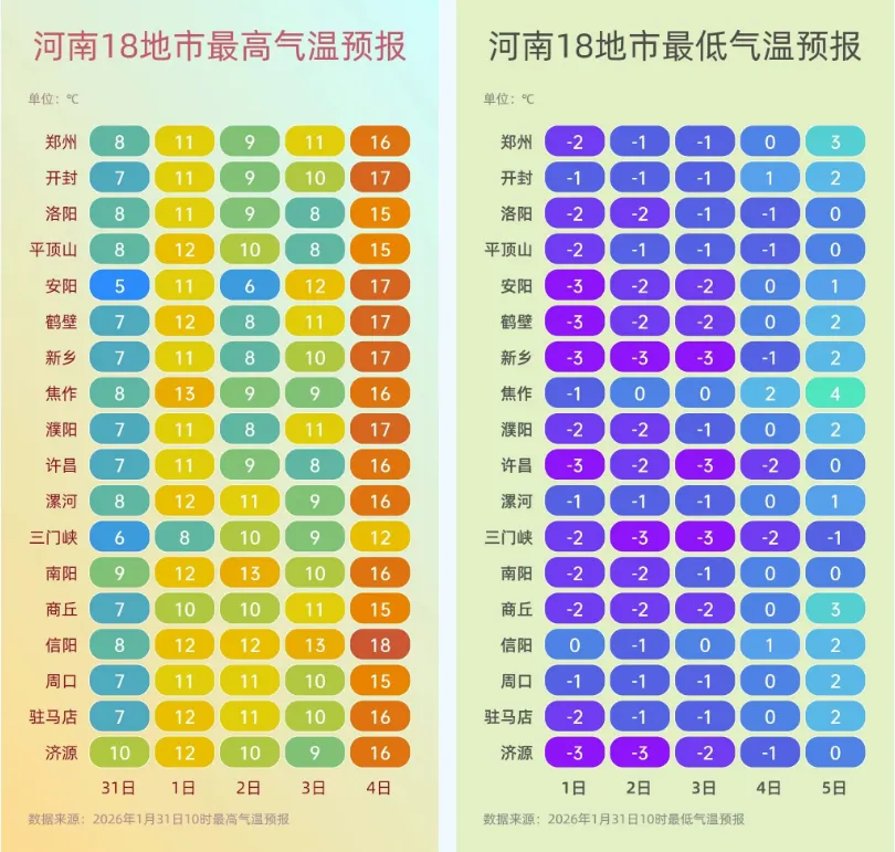 今天多地最高气温将升至10℃以上,2日至3日最高气温略有波动。但是到了4日!全省大部地区最高气温超15℃,中午前后暖如初春。但是最低气温依旧维持在0℃左右,早晚寒凉,大家还是要及时添衣,谨防感冒。预计至2月4日,我省霾天气逐渐发展,全省大部有轻到中度霾,北部、中西部局部有重度霾。5日至6日,受冷空气影响,全省霾天气自北向南减弱消散。(河南气象)