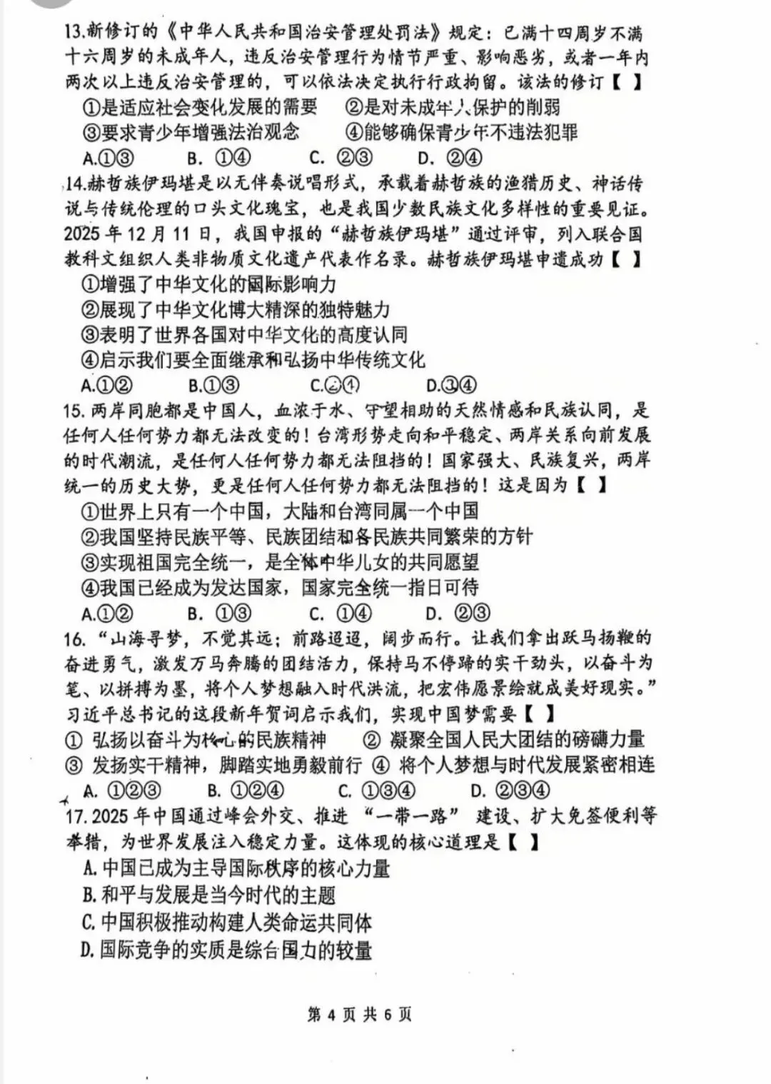 【期末】郑州外国语中学2025-2026上期九年级道德与法治期末测试(可下载)
