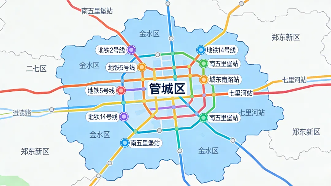 地铁 1/2/3/5/9 号线贯穿管城区,航海东路、中州大道、南三环等主干道形成立体交通网络,客流辐射郑州南部及新郑、尉氏等周边区域,是南部交通枢纽。