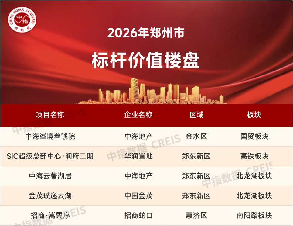 2026年1月,郑州商品住宅销售金额排行榜TOP10项目合计销售金额为7.14亿元,其中TOP10的销售金额门槛值为0.50亿元。中原华曦府以1.48亿元的销售额位列销售金额排行榜首位,正弘序以1.01亿元的销售额位列第二,中海云著湖居以0.70亿元位列第三。销售面积方面,TOP10项目合计销售面积为4.16万平米,TOP10项目销售面积门槛值为0.29万平米。中原华曦府以0.91万平米的销售面积位列排行榜首位,正弘序以0.56万平米的销售面积位列第二,中原润府以0.40万平米位列第三。特别声明:标杆价值楼盘是在中房指数系统理论体系和架构的基础上,从百城新建住宅价格指数样本项目中选取在所属城市有较强知名度和广泛影响力的典型样本项目,以“典型性”“代表性”为基本原则,从销售表现、产品创新等方面对样本楼盘进行研究,肯定项目的典范代表地位。本报告仅供参考,不对使用报告及其内容所引发的任何直接或间接损失承担责任。金水区 ▍中海峯境叁號院