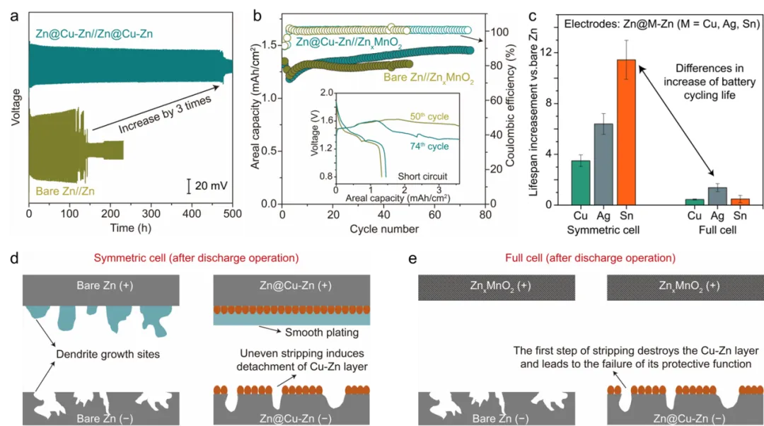由锌金属表面非均质性引发的锌枝晶生长问题限制了锌离子电池寿命,为此,研究人员已开发多种策略对锌金属表面或体相进行改性,构建人工界面层是其中一条关键路径。作为其中一大类,一些常见的、稳定的、活泼性弱于锌的金属几乎都被用作界面层材料。在长循环过程中,金属表面层的稳定性和均匀性决定了其抑制锌枝晶生长的能力,其真实相结构则决定了电化学调控机制。在以往的研究中,研究人员着重于评估Zn@Metal在对称电池中的镀锌形态以及镀锌-剥离循环后的表面变化,显示能够实现平滑镀锌,显著提升对称电池寿命。然而,在全电池体系中,锌负极经历剥离-电镀过程,这是与电镀-剥离相反的过程。在这一逆向过程中,表面层的结构演变、实际相结构和长期稳定性常常被忽略,同时全电池寿命提升不显著。