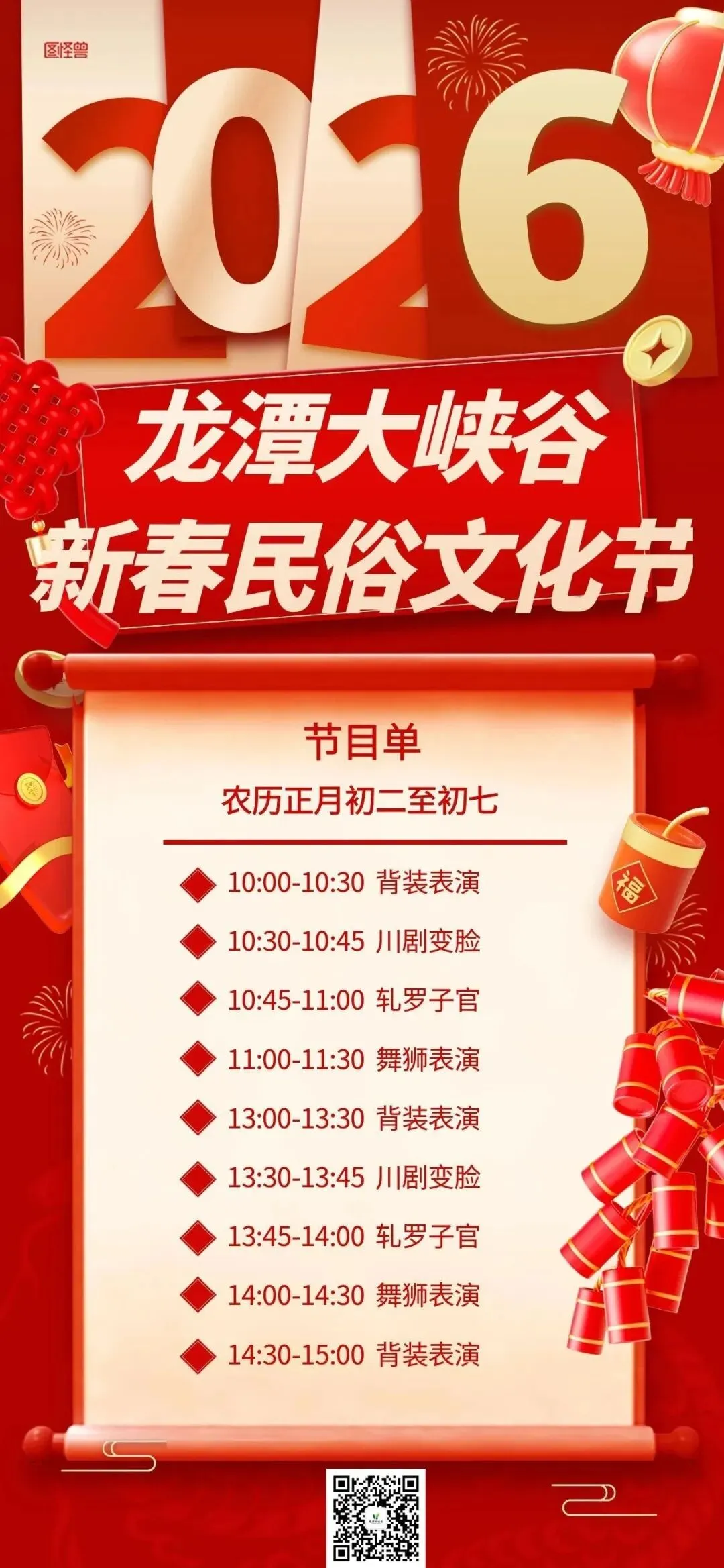 中华舞狮的压轴大戏——高空舞狮、民间造型艺术——背装、川剧变脸和轧罗子官等传统民俗表演,将带您沉浸式体验民俗文化和民间艺术的独特魅力。