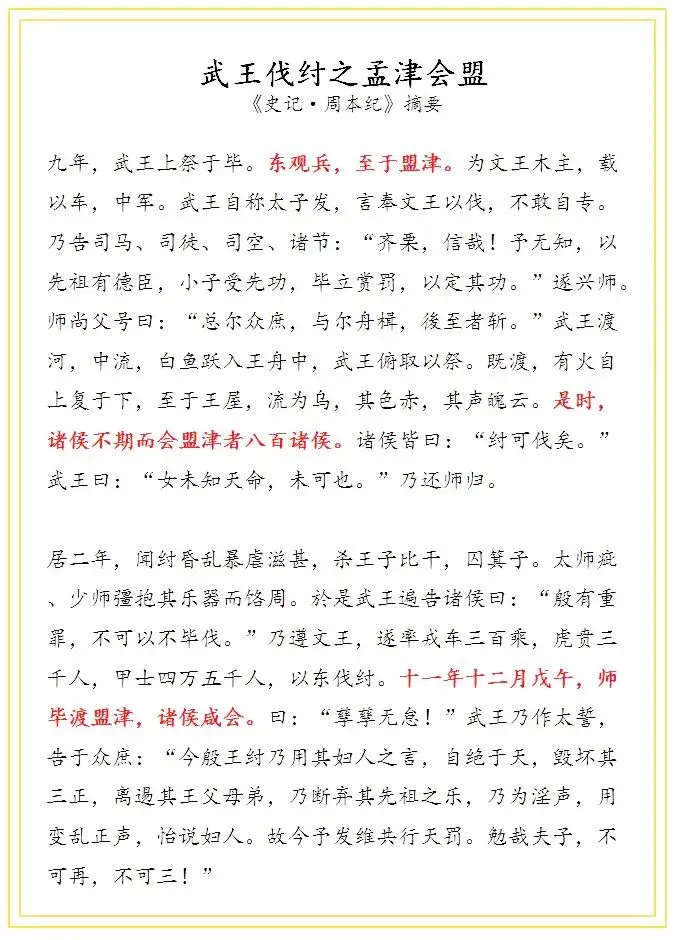 《史记·周本纪》详细记载了孟津观兵的过程,摘录如下: