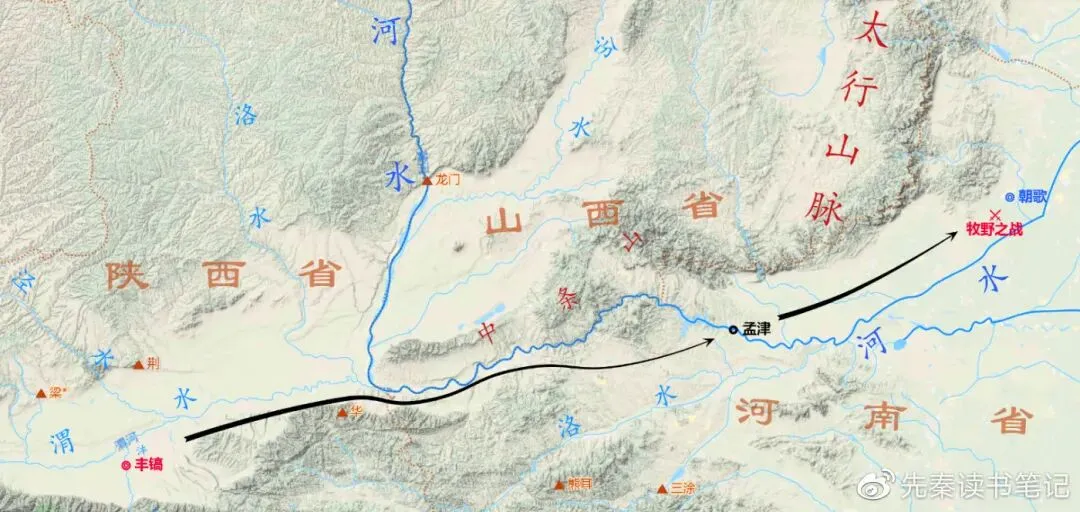 ▲武王伐纣路线示意图。图源:先秦读书笔记。