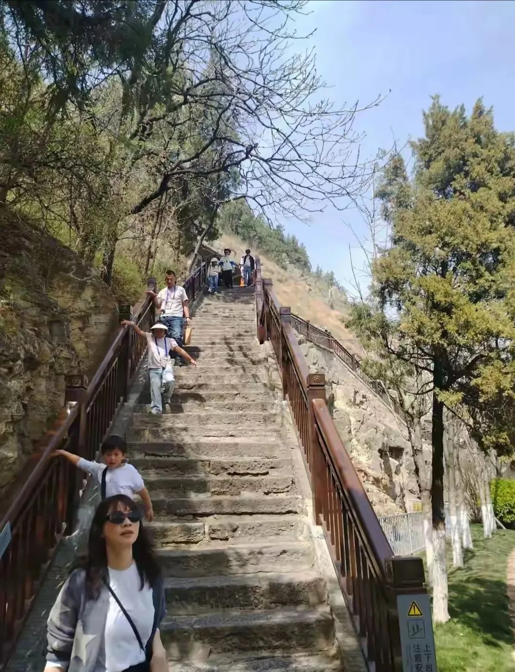 看到了很多石窟,也有外国人来旅游,听到导游用英语解说,好不羡慕!后来就要下去了,石阶好陡呀!都磨得光滑滑的,有点害怕!岁月的痕迹!站在下面看走下来的人群,有一种释然,我总算下来了!