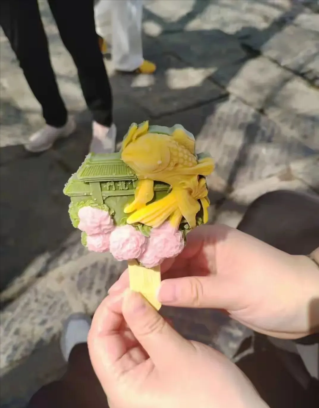 走热了,路边有卖文创雪糕的,闺女买了一个,花了18元,上面有龙门的字样!冰糕杆上还刻着字呢!感觉洛阳人很注意细节!