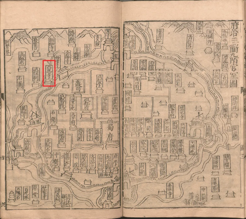 明代《新修成都府志》中的“府治三衢九陌宫室图” ,清楚地描绘了白马寺所在位置,现藏于美国国会图书馆 (图源:《舆鉴·金牛》)
