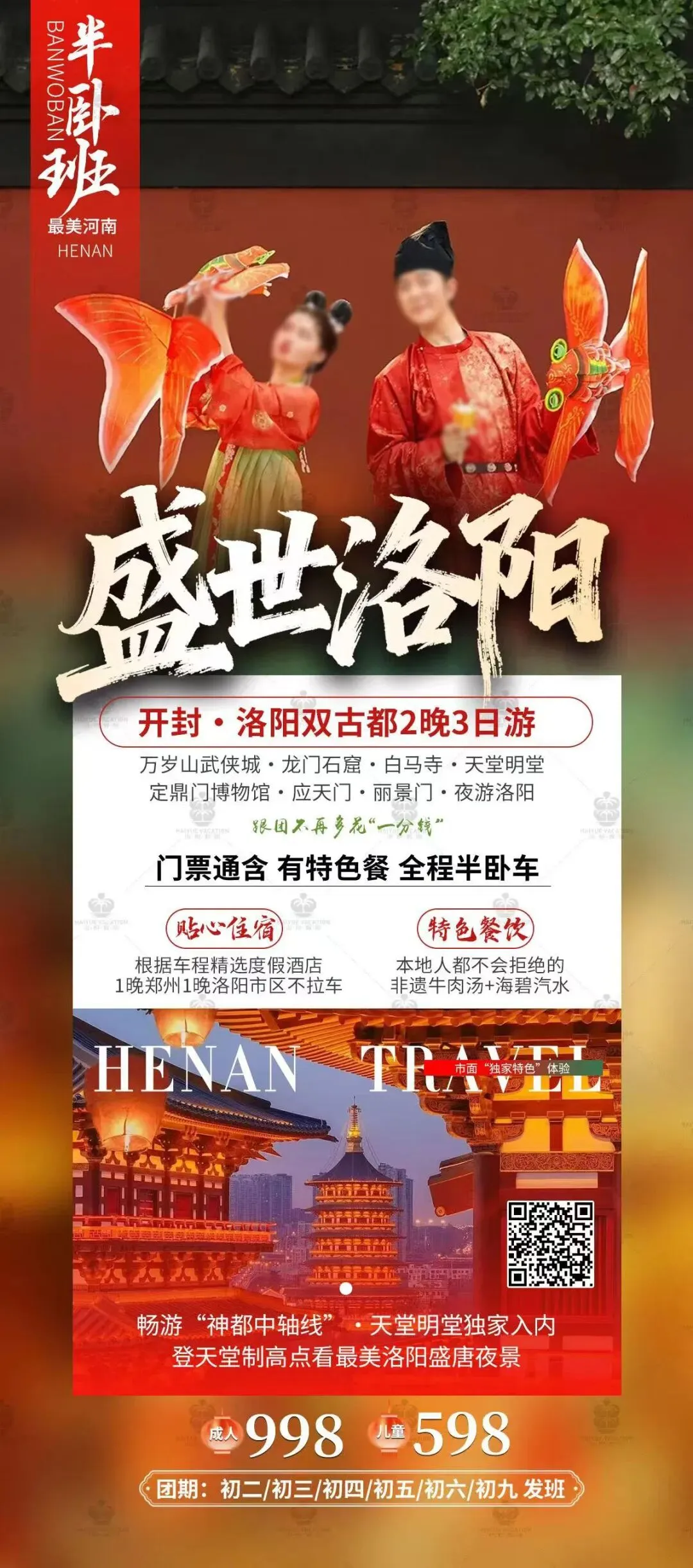 不游览龙门石窟的游客,给您安排了【自由度超高的古都City Walk】游览【丽景门】丽景门,是一座重现古都洛阳风貌的城楼,是洛阳八大景之一,也是集吃、住、行、游、购、娱为一体的大型综合性旅游景区,有“中原第一楼”“古都第一门”之称,有“不到丽景门,枉来洛阳城”的美誉。保存完好的老街西大街,林立的非遗店铺,私下弥漫的烟火气真的很迷人,望一眼估计额的车水马龙,吃一吃洛阳的特色小吃,已经成为过年有烟火气的bi游地之一!