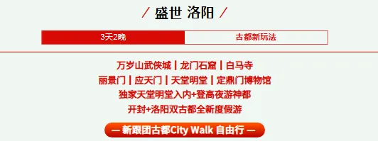 出发前往开封→【万岁山武侠城】白+黑沉浸式游览→入住指定酒店能量早餐→【定鼎门遗址博物馆】→中餐【洛阳非遗牛肉汤+海碧汽水】→【丽景门】→【十字街】→可加选【龙门石窟】含导游讲解→【应天门】广场→【天堂&明堂】→【登天堂制高点看夜景】→入住指定酒店