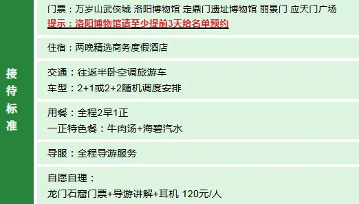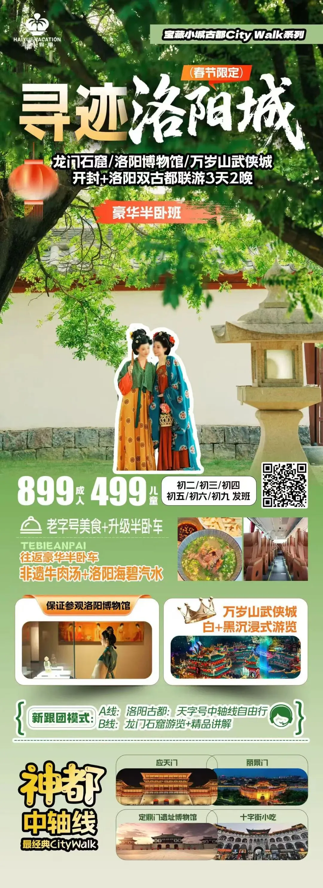 游览【龙门石窟】(天阀):龙门石窟是石刻艺术宝库之一,与莫高窟、云冈石窟、麦积山石窟并称四大石窟。作为世界文化遗产的龙门石窟,文化底蕴深厚。自北魏孝文帝迁都洛阳,在龙门西山开凿古阳洞开始,经历400余年的光阴,7个朝代的不断营建,才形成了如史诗般恢弘的摩崖群雕。推荐参观:龙门石窟门票+耳机+讲解套票 120元/人 请您自理。主游览路线:潜溪寺 宾阳中洞 宾阳南洞 摩崖三佛龛 万佛洞 莲花洞 香山寺石窟雕塑是佛教艺术中珍贵的遗存,龙门石窟内一尊尊慈悲亲切、仪态万千的佛菩萨雕塑,在信仰者的虔诚礼拜中,在工匠们的巧夺天工中,把冰冷的石窟渲染成庄严肃穆而又温暖宁静的圣殿,给信众们带来了通往佛国净土世界的希望。不游览龙门石窟的游客,给您安排了【自由度超高的古都City Walk】游览【丽景门】丽景门,是一座重现古都洛阳风貌的城楼,是洛阳八大景之一,也是集吃、住、行、游、购、娱为一体的大型综合性旅游景区,有“中原第一楼”“古都第一门”之称,有“不到丽景门,枉来洛阳城”的美誉。保存完好的老街西大街,林立的非遗店铺,私下弥漫的烟火气真的很迷人,望一眼估计额的车水马龙,吃一吃洛阳的特色小吃,已经成为过年有烟火气的bi游地之一!沉浸式的烟火丽景门走到头就来到了【十字街】;没错,它自古以来就是商人云集之地,建国之后这里成为洛阳市重要的商业区之一,现在这里大的特色就是全国小吃的汇集之地,不光有洛阳水席、不翻汤等本地美食,还有烤猪蹄、涮牛肚、taco等等外地美食,只有你没吃过,没有你没见过,更重要的是,不光是种类多,价格还很实惠。